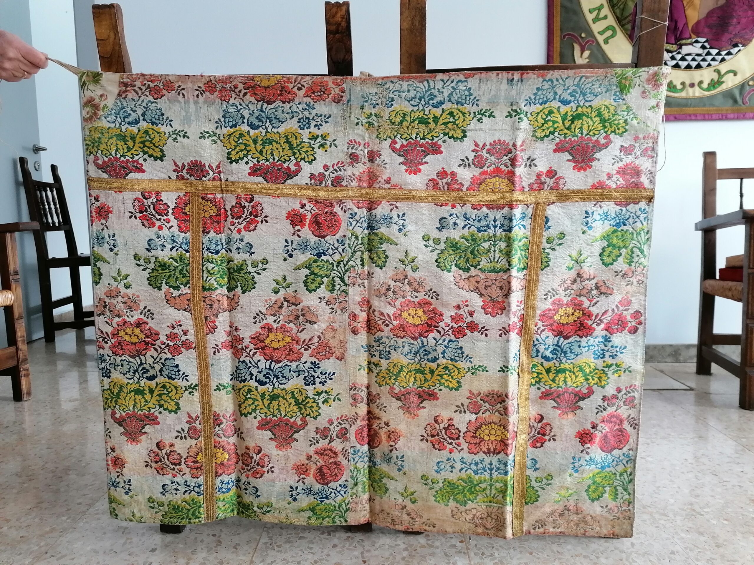 Colgadura ventanas para procesiones de telas nobles antiguas, sedas, damascos, brocados, con ataduras.
